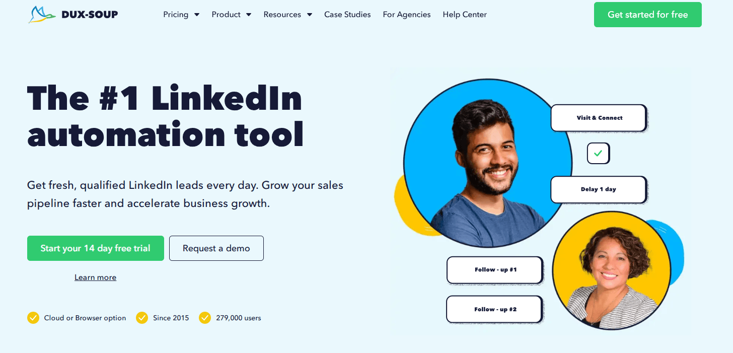 Dux-Soup is a LinkedIn automation tool that helps with inbound lead generation and outreach. It’s a Chrome extension connected to your LinkedIn account.