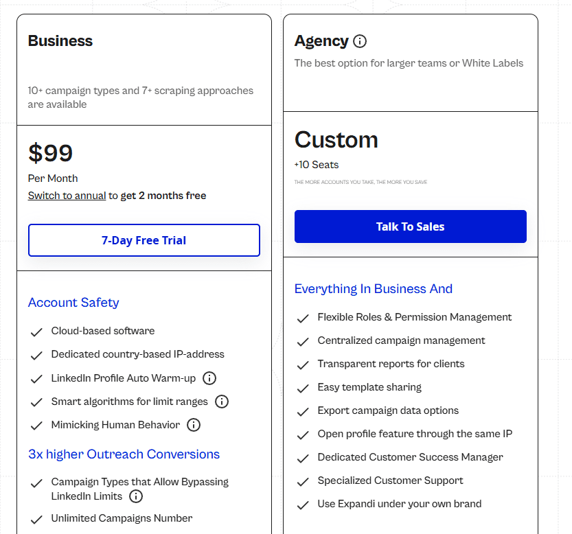 Expandi has a fixed plan at $99 per month. Custom pricing is available for bigger teams and agencies. You can test the platform for free.