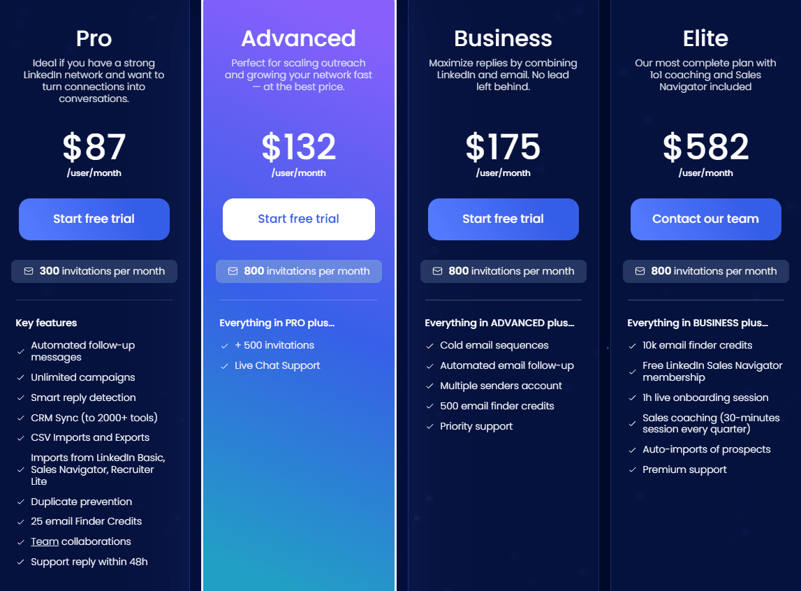 Waalaxy starts at $87 per month with LinkedIn inbox and offers a free trial. You can send up to 800 invitations monthly.