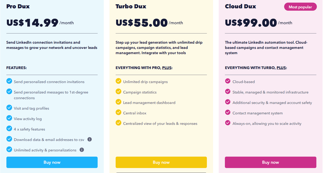 For sales teams or professionals who need more flexibility, Dux-Soup Cloud offers the full experience, but at a higher price of $99/month.