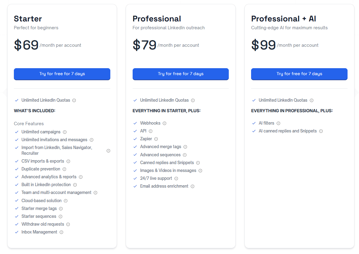 | Dux‑Soup | $14.99/month | Basic to advanced automation | Profile visits, simple messaging, unlimited smart drip campaigns, CRM integration | 4.3/5 |