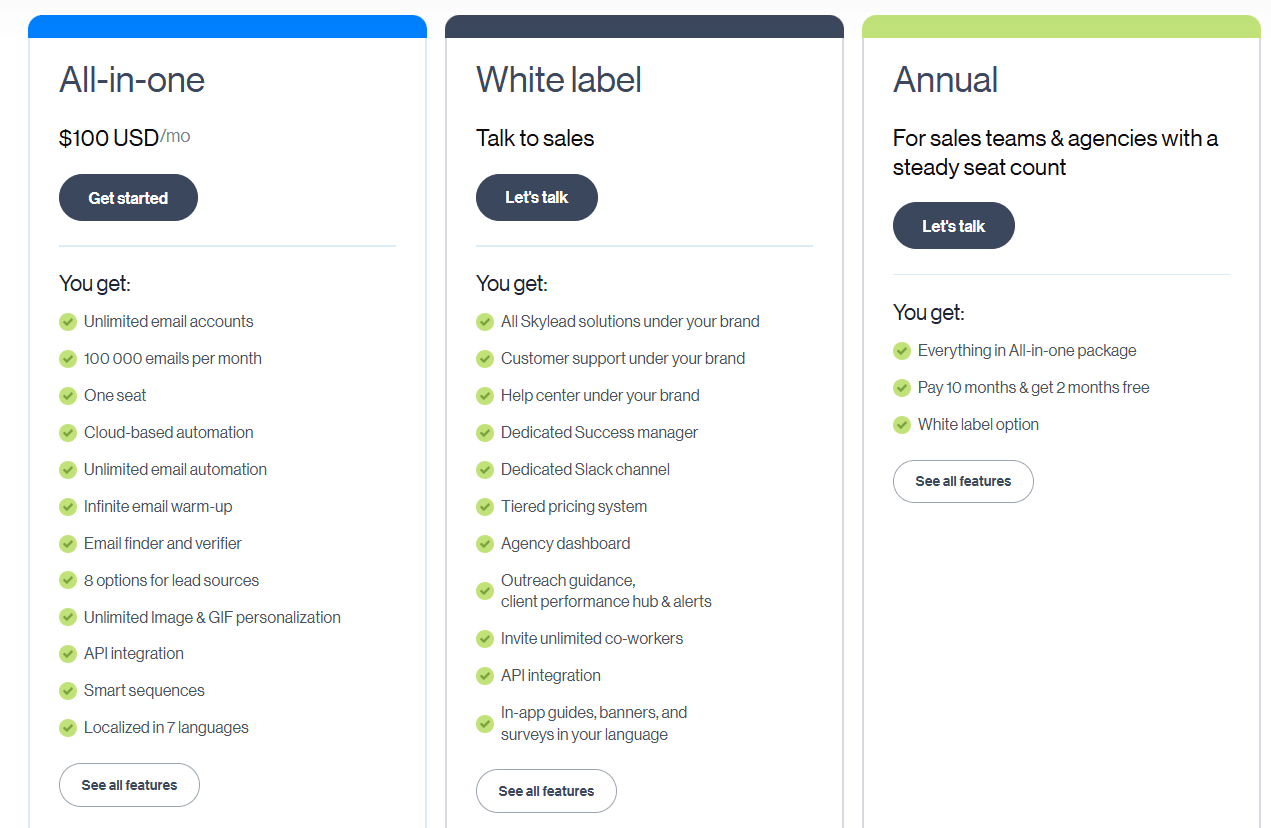 Skylead has one main plan at $100 per month. You get unlimited email accounts, 100,000 emails per month and full LinkedIn automation.
