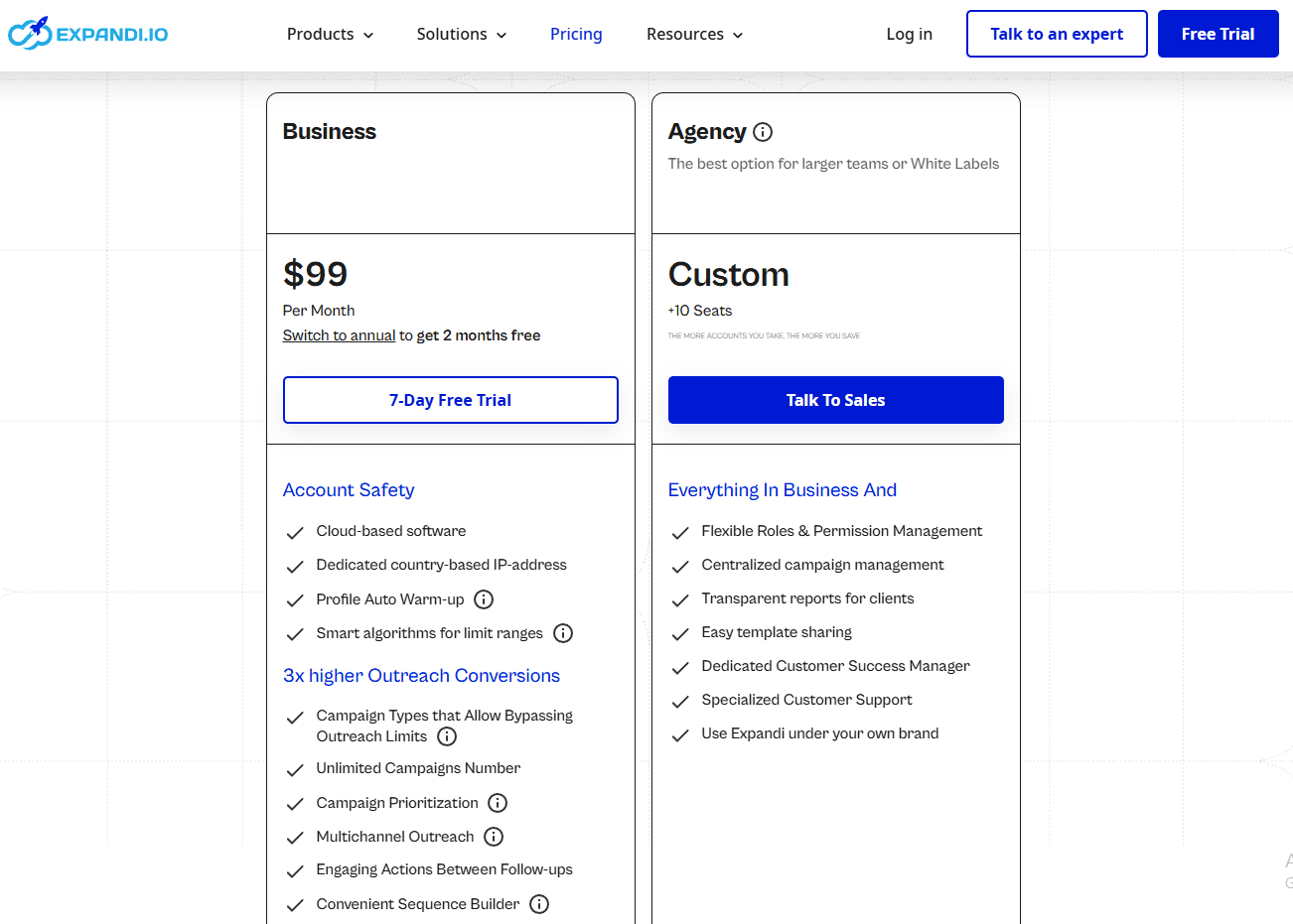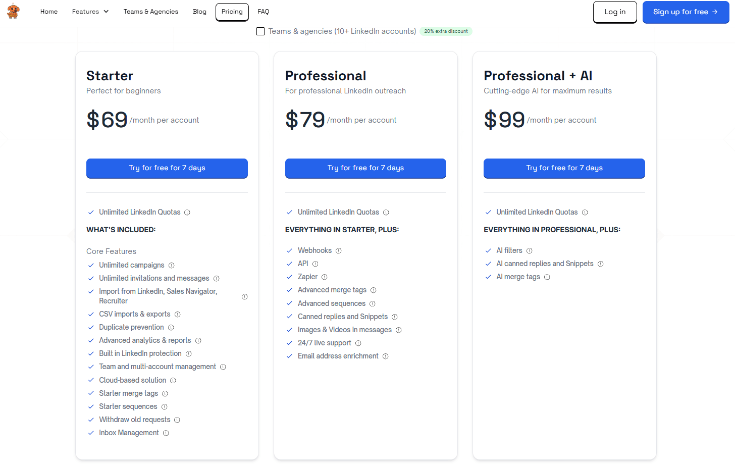 Expandi’s pricing begins at $99 per month. The next available tier is a custom plan for teams with 10 or more seats. This setup leaves a gap for smaller teams that only need a few accounts.
