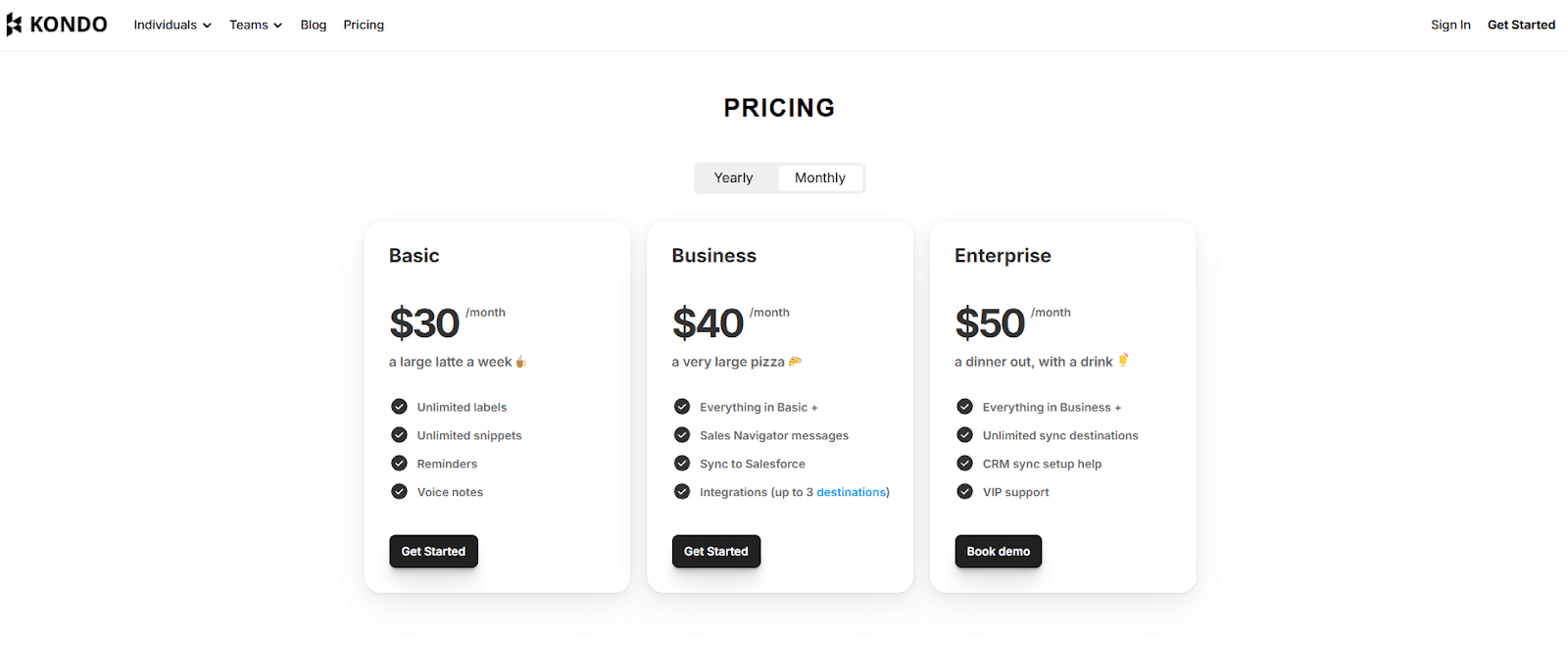 Kondo’s Basic plan starts at $30/month with no bulk or team discounts and only core features like labels, snippets, reminders and voice notes.