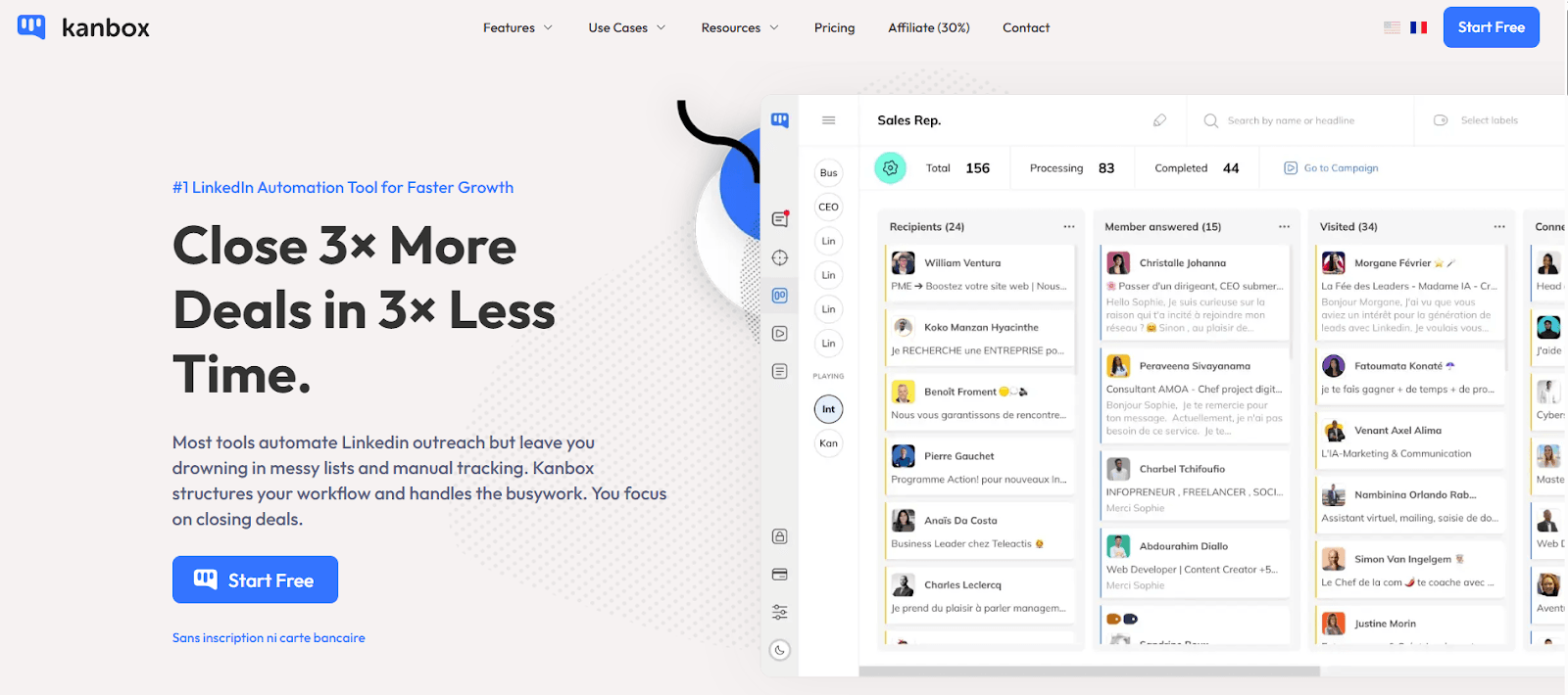 Kanbox lets you manage several LinkedIn accounts and organize outreach in one workspace. Switch between profiles instantly, track all messages in a unified inbox, and assign teammates without sharing passwords.
