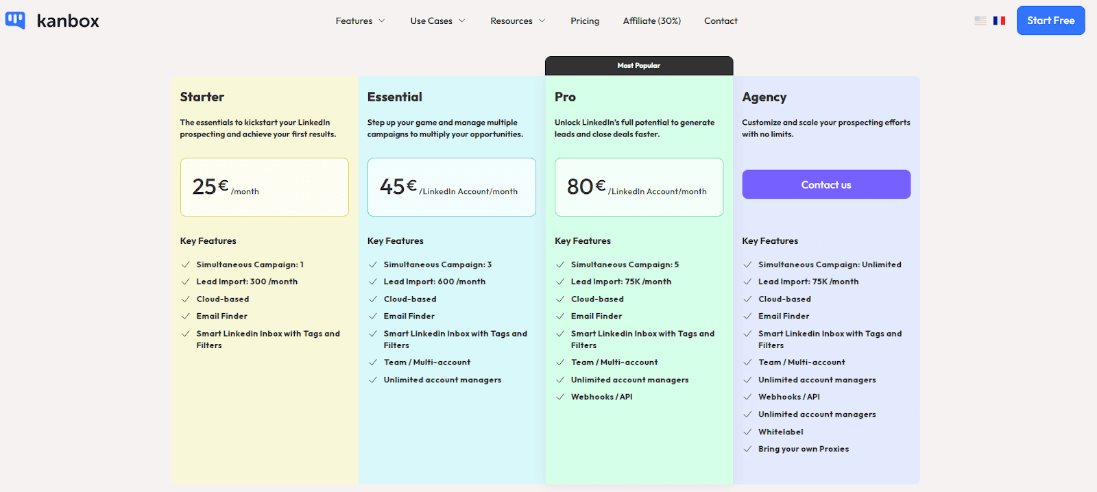 Kanbox offers four pricing tiers, starting at €25 per month.