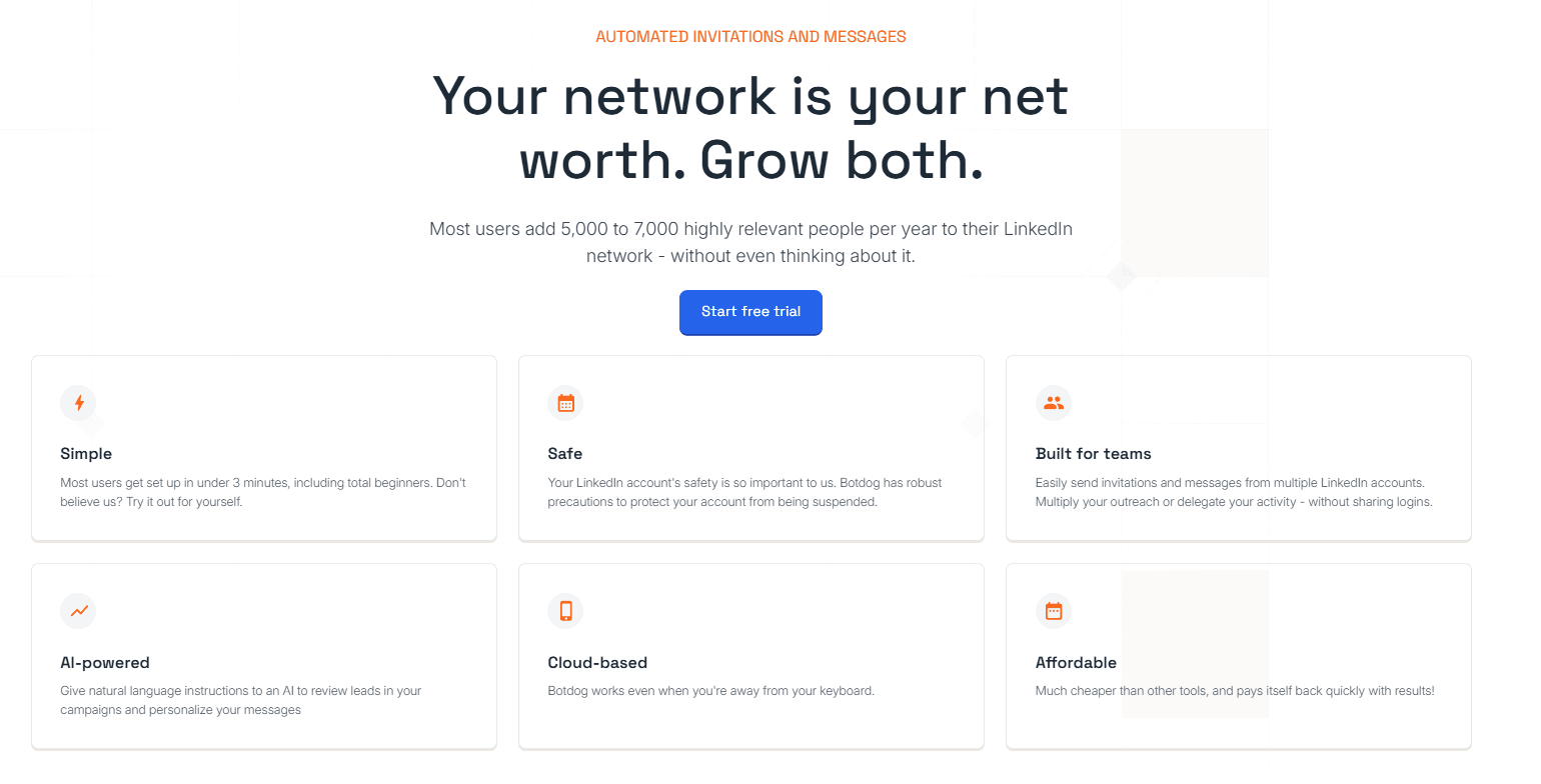 With Botdog, you can add around 5,000–7,000 targeted contacts each year, and it takes care of connection requests and follow-ups for you.