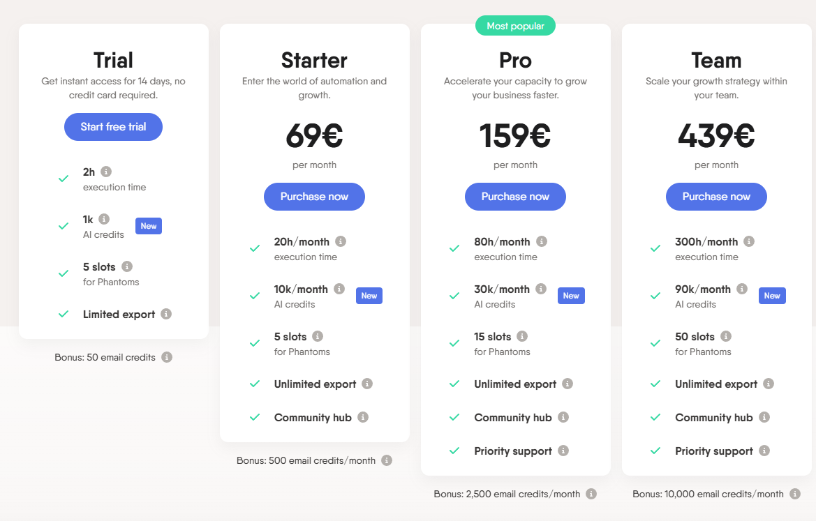 Its prices go up based on how much automation time, AI credits, and Phantom slots you need. The Pro plan is best for heavy users, while Team suits larger organizations that run many automations.