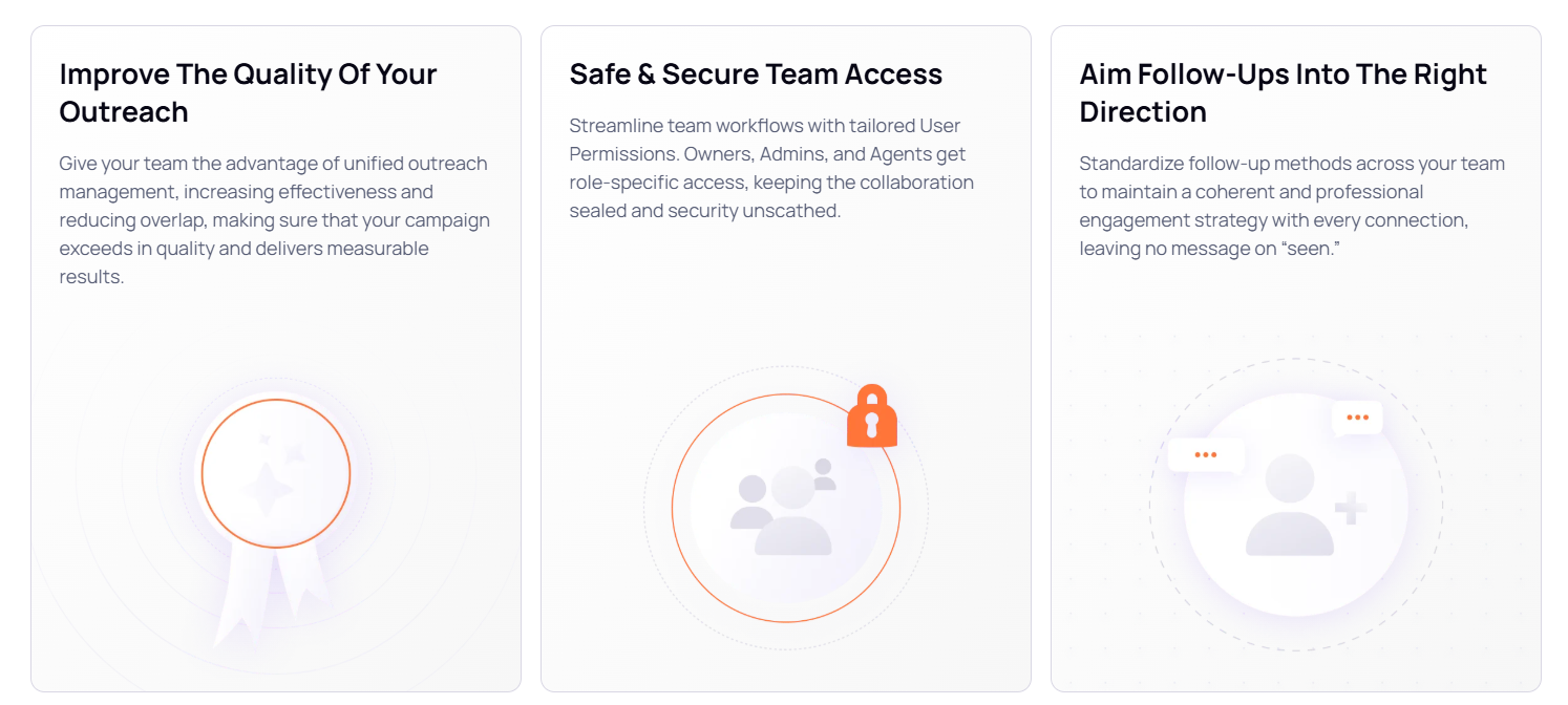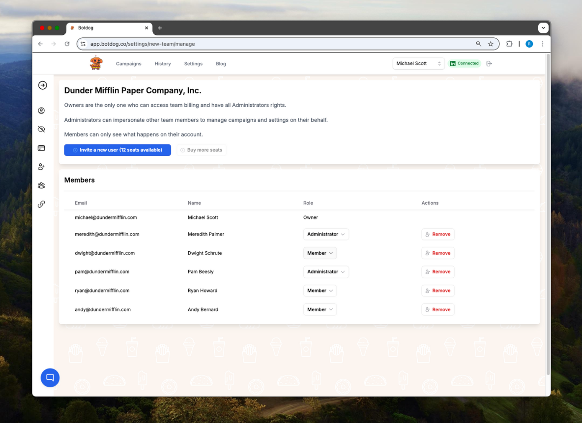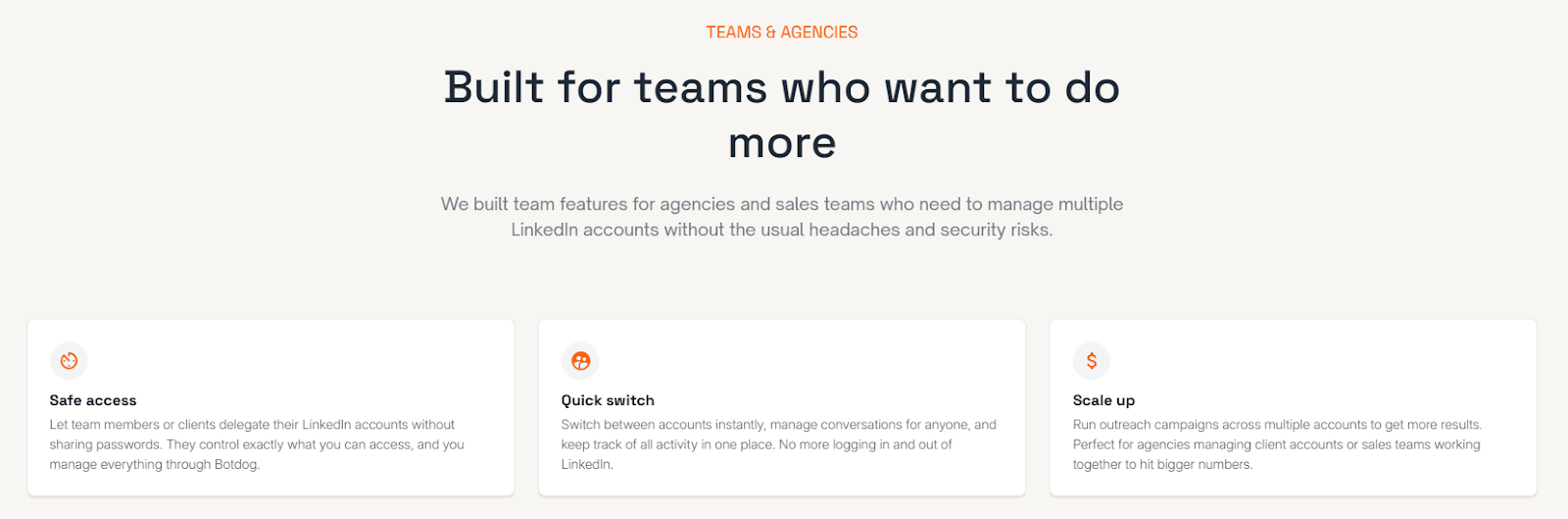 While Botdog was primarily designed for individual reps and small sales teams, it still offers streamlined multi-account management from day one. With a unified team inbox, all conversations from connected LinkedIn accounts appear in one place. Team members can assign messages, use canned responses, and maintain role-based permissions.
