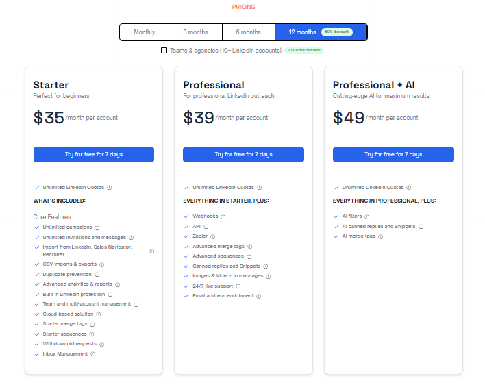 It’s important to note that, like most automation tools, Aimfox is priced per seat, even though it advertises “unlimited LinkedIn accounts per workspace”.