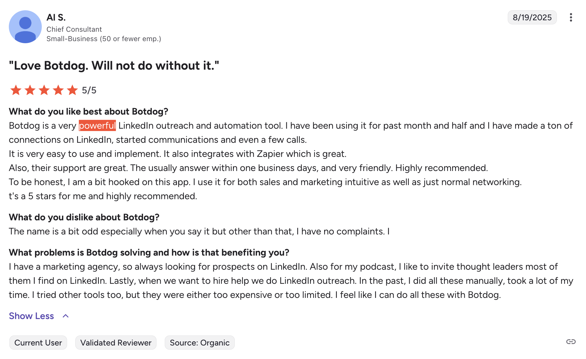 Botdog: Minimal learning curve. Most users are operational in 3-20 minutes. Interface designed for simplicity - if you can use LinkedIn, you can use Botdog.