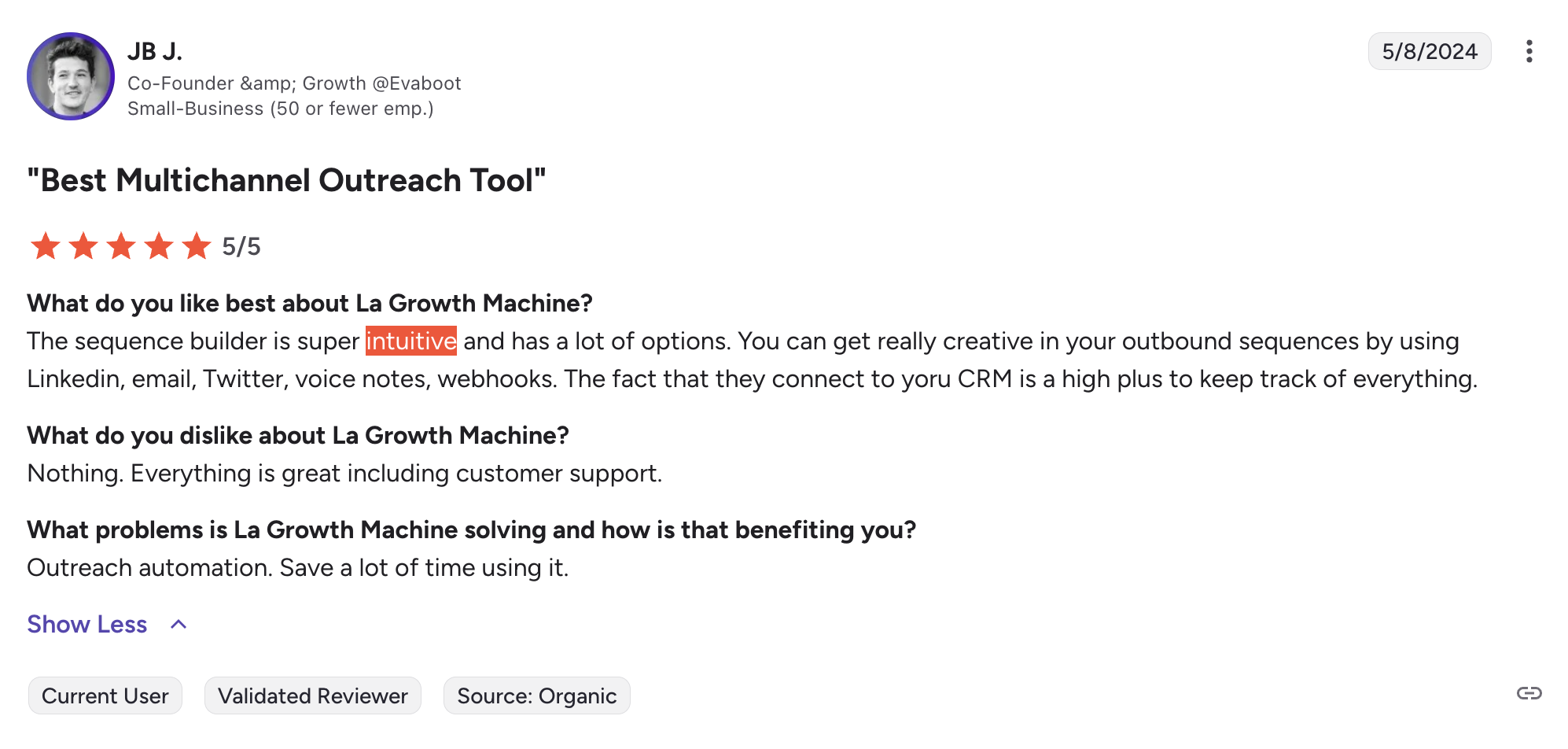 La Growth Machine has strong reviews overall (4.6/5 on G2 from 53 reviews), with users loving the multi-channel approach. However, some users point out drawbacks.