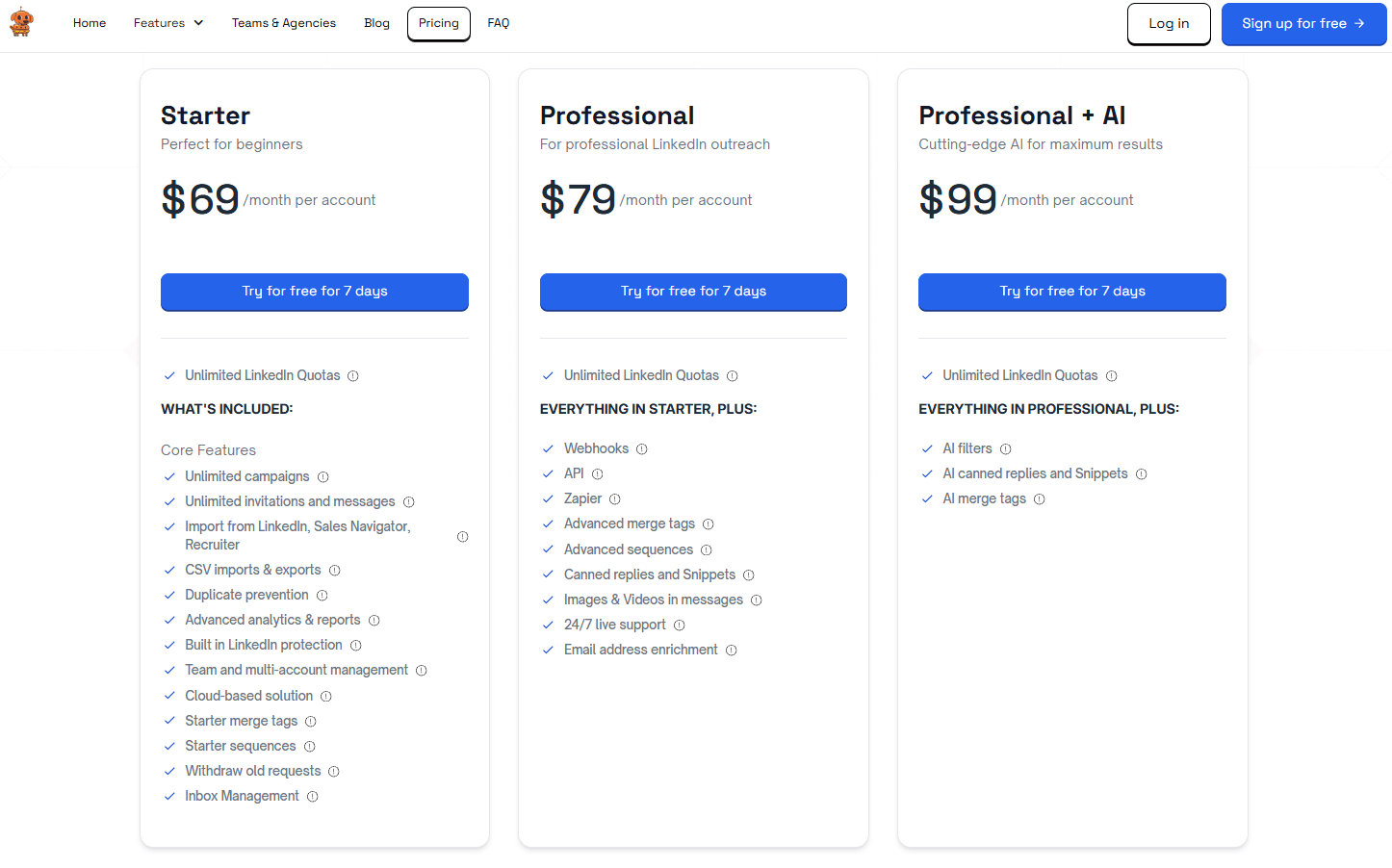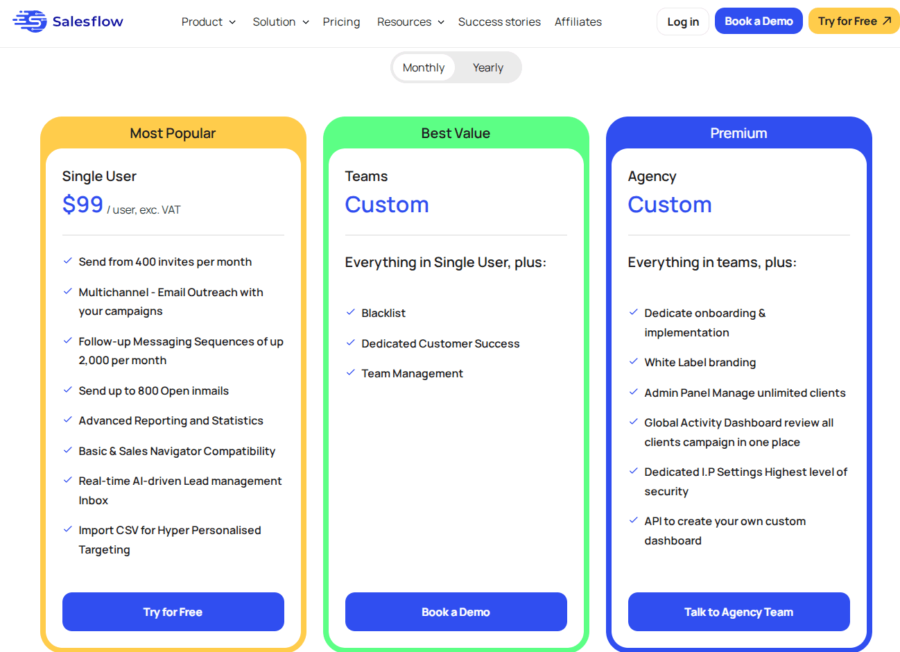 Salesflow starts at $99 per user per month for 400 invites, 2,000 follow-up messaging sequences and 800 open InMails.