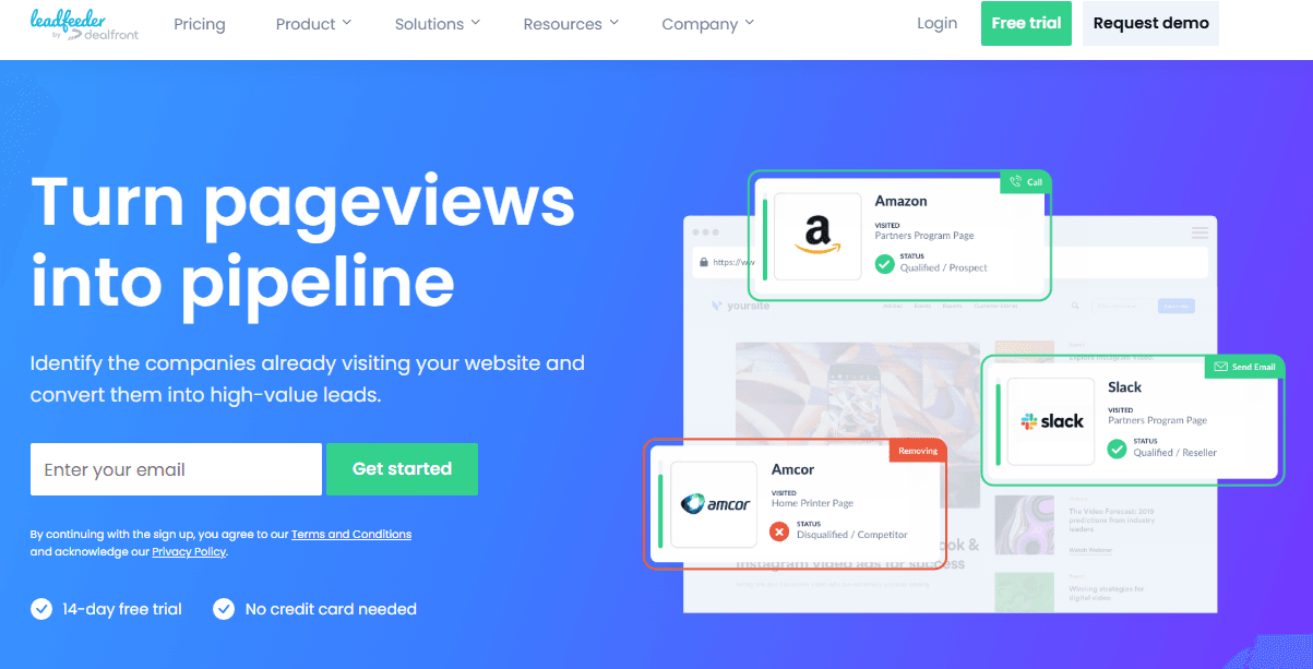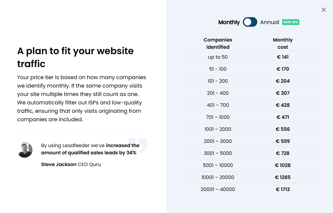 | Leadfeeder | $141 | Website visitor tracking, lead generation | Visitor identification, CRM integration, lead scoring, behavior tracking, unlimited users on paid plan | 4.3/5 |