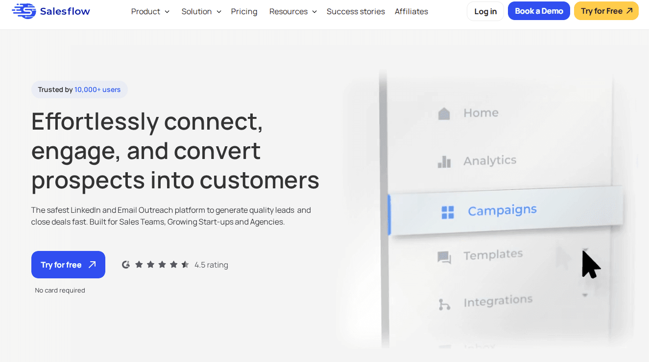 Salesflow scores 4.3 out of 5 stars on G2. People like the LinkedIn integration and campaign management tools. The interface gets mixed reviews as some find it a bit clunky to navigate.
