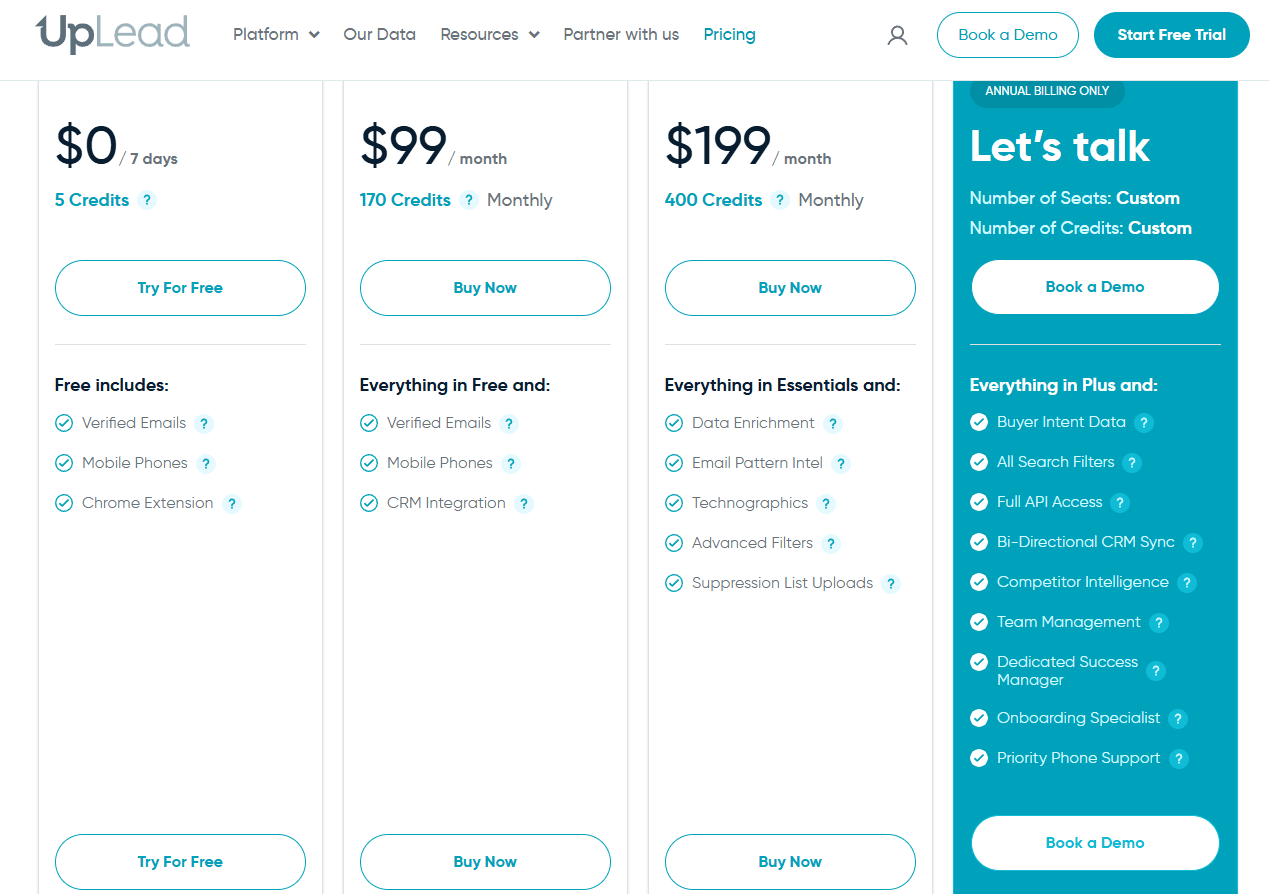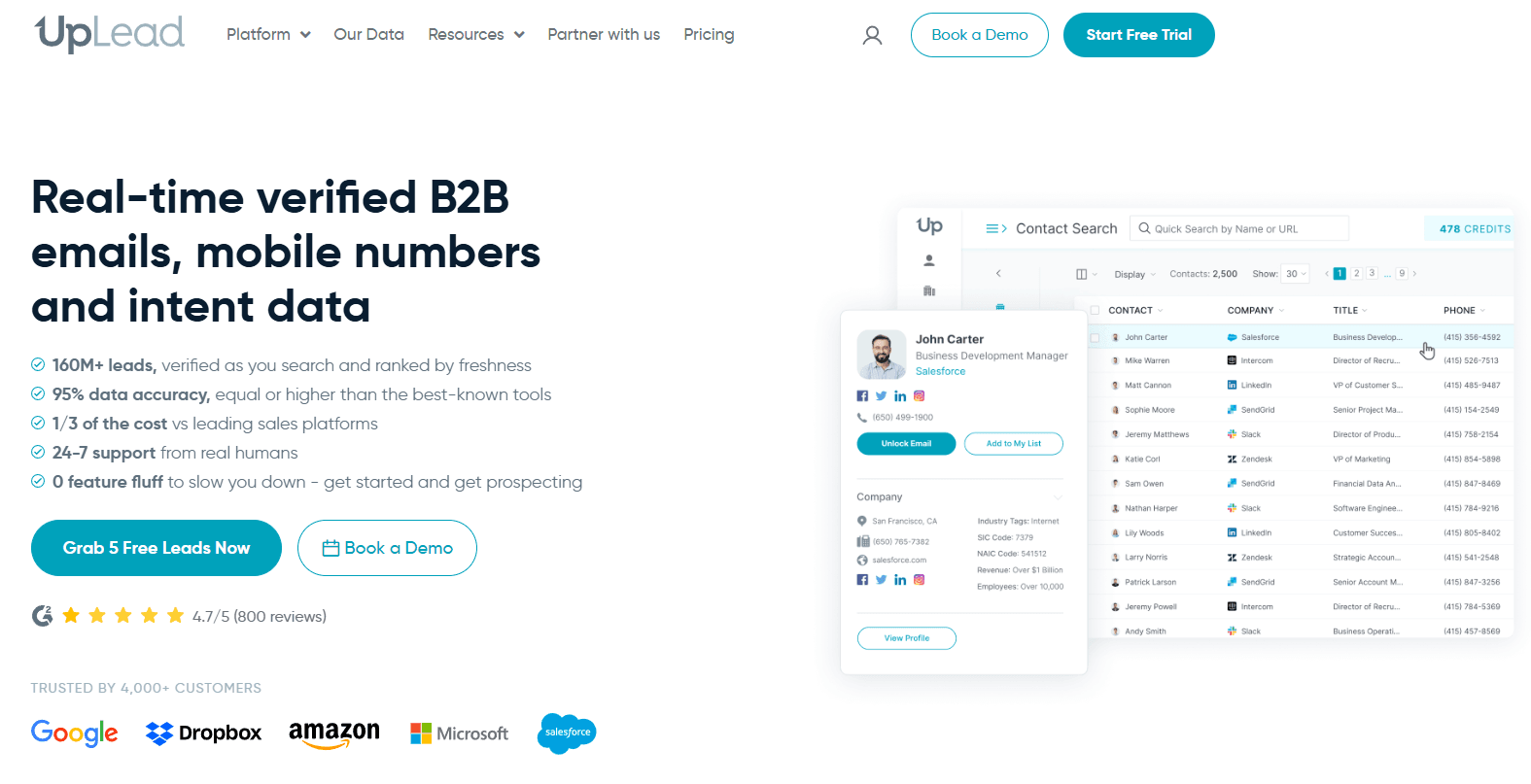 | UpLead | $99 | B2B lead generation | Prospector with 160M+ contacts, data enrichment & verification, API, intent data, granular filters | 4.7/5 |