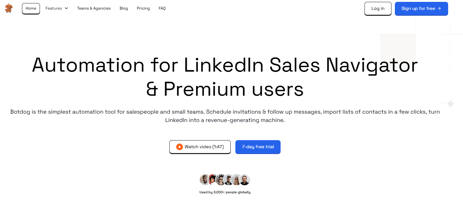 | Botdog | $69 | Secure automation with built-in safety measures to protect LinkedIn accounts from suspension | Automated sequences, team management, shared inbox, search exports, advanced reports | 4.9/5 |