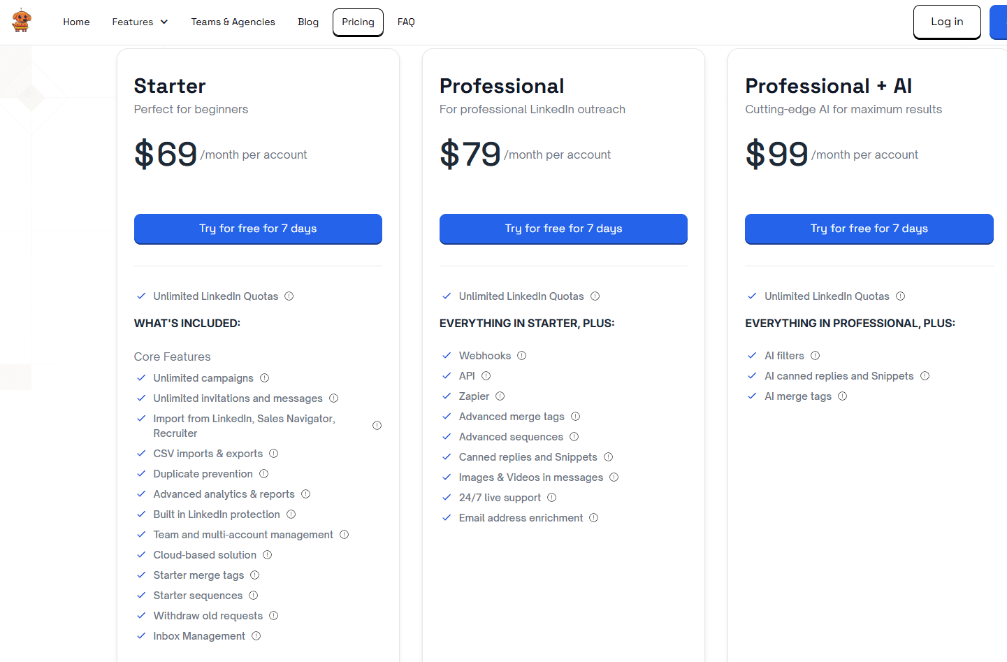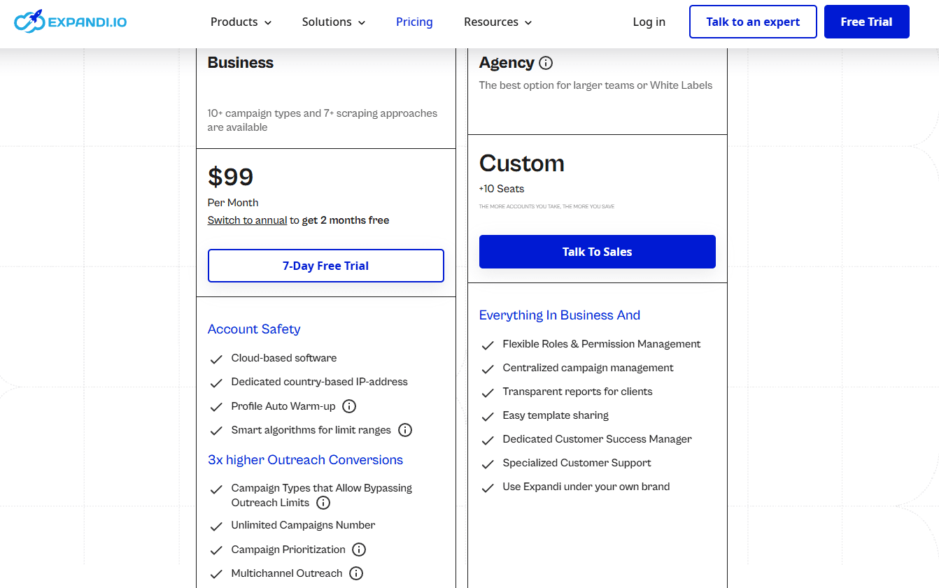 Expandi's pricing starts at $99 per month. The next step up is a custom plan for 10+ seats, which requires talking to sales. It leaves no middle option for small teams needing 2–5 accounts.