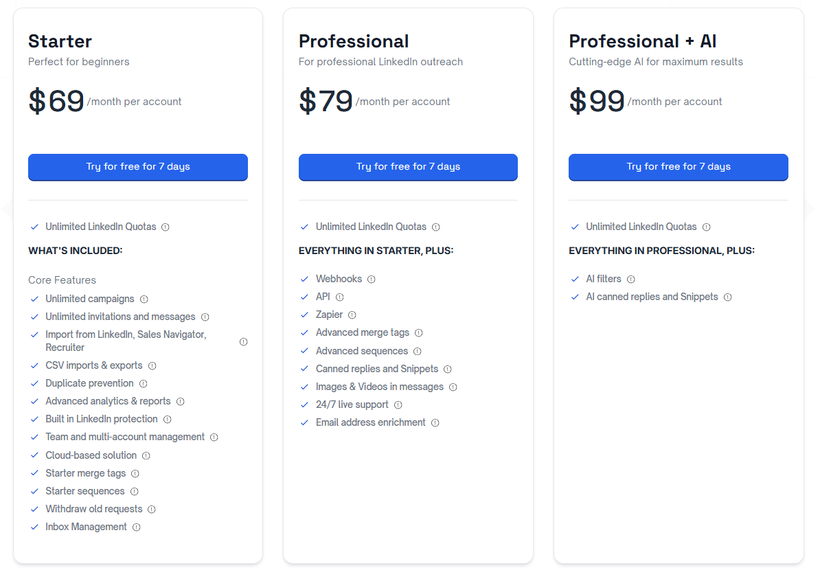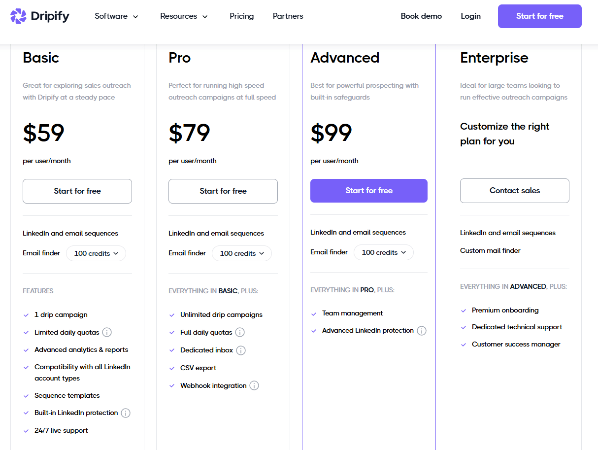 Dripify starts at $59/month for one drip campaign, 100 credits for email finder and limited daily quotas.