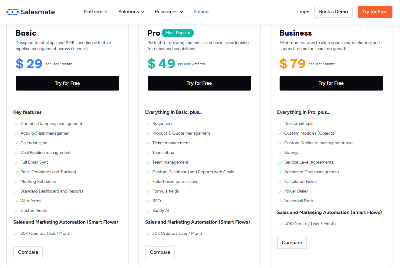 Salesmate starts at $29/month with basic features and 20K credits for sales and marketing automation.