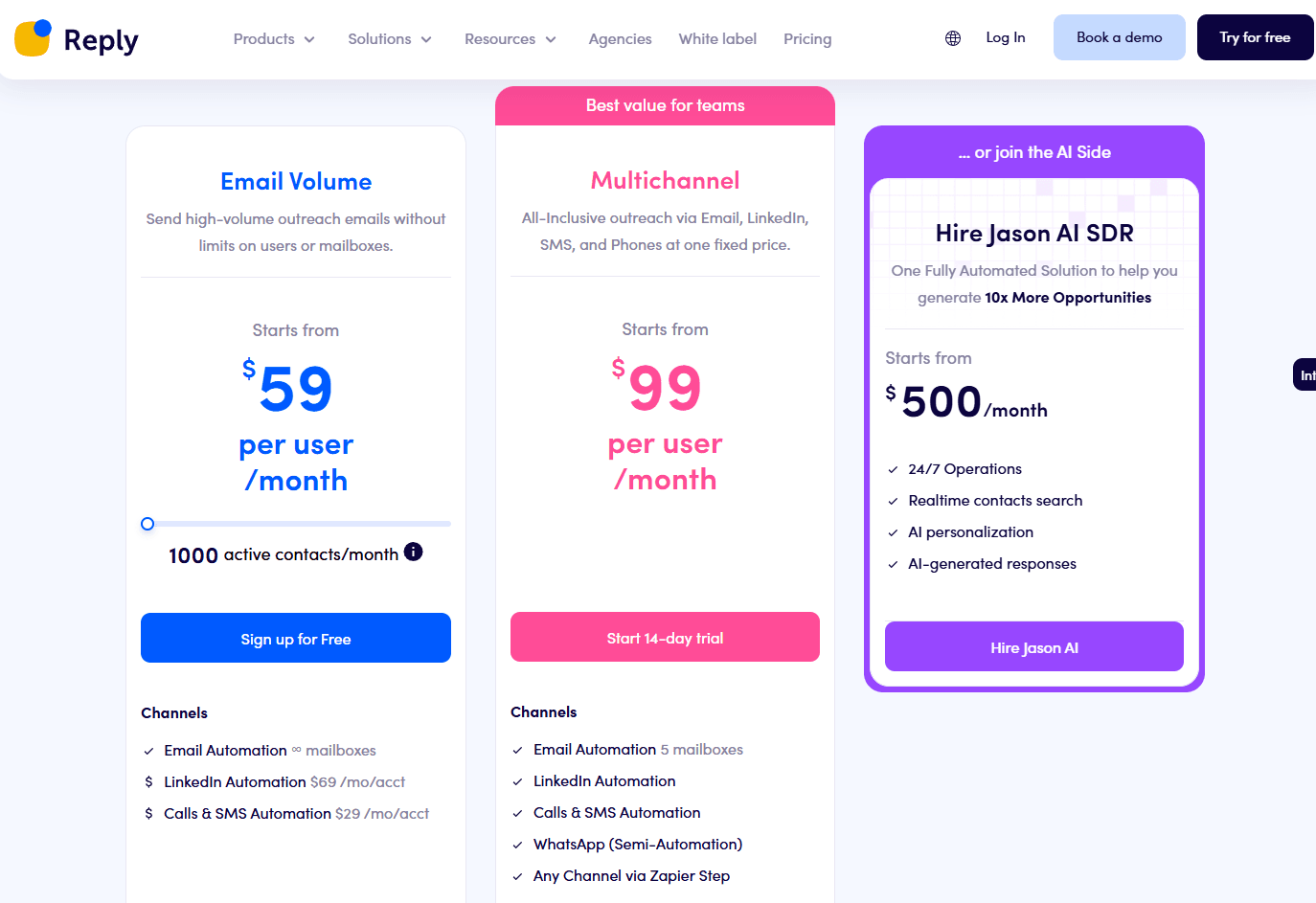 Reply.io starts at $59/month with email automation and 1,000 active contacts. You need to pay an additional $69/month for LinkedIn automation and $29/month for call and SMS automation.