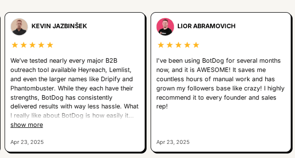 With AI-powered lead review, shared inboxes, and robust export options, Botdog helps you scale outreach while keeping every interaction personal and safe.